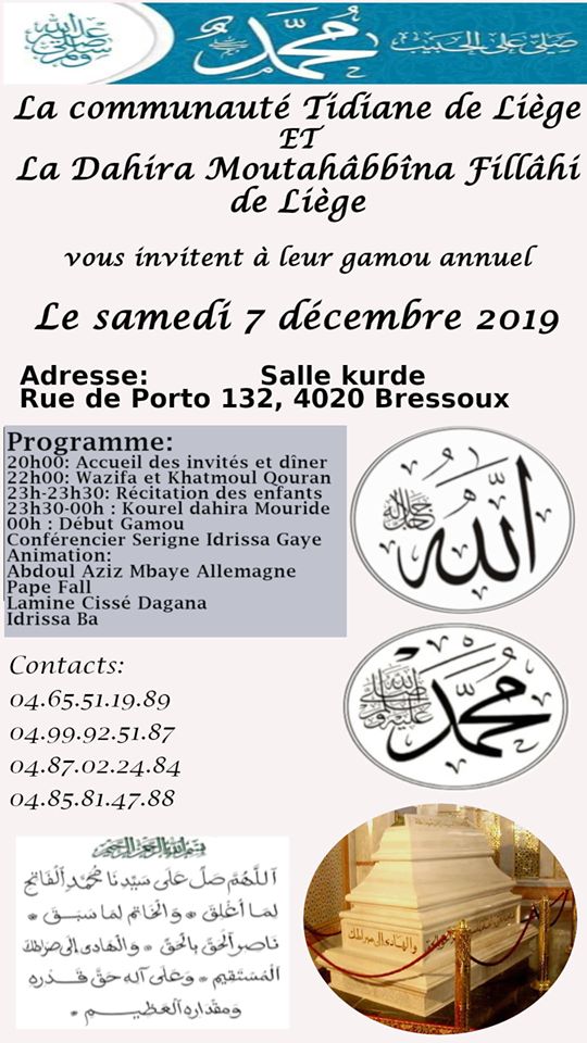 Placé sous le sceau de la fraternité musulmane, le Gamou annuel de la communauté Tidiane de Liège initié par la Dahira Moutahabbina Fillahi se tiendra ce samedi 7 décembre à partir de 20 heures à Liège, à la Salle Kurde sur la Rue Porto à Bressoux. L’événement est parrainé par SEM Amadou Diop, Ambassadeur du Sénégal en Belgique et au Luxembourg.