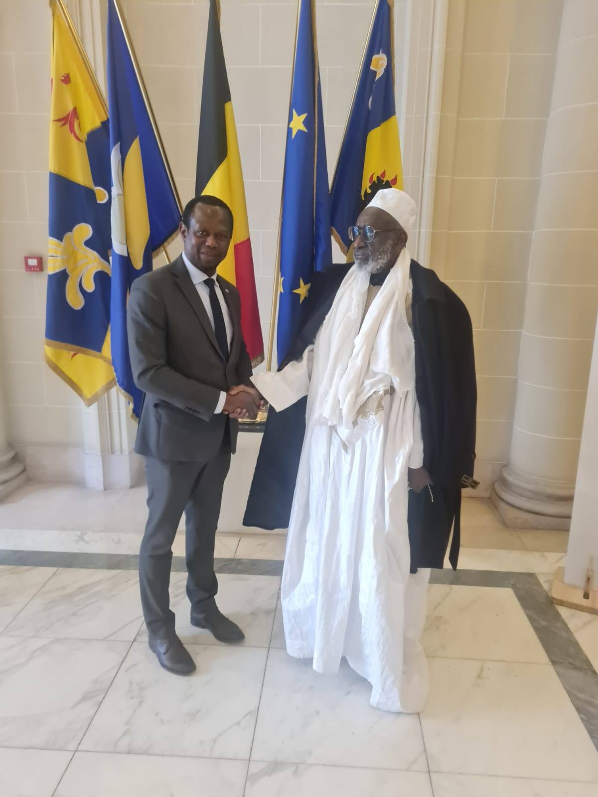 Le Sénateur Diallo Elhadj Moussa accueille le Khalife Thierno Madani Mountaga Tall au Parlement européen : une rencontre historique entre héritage africain et engagement politique.