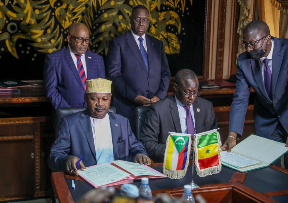 Le Président Macky Sall a été honoré à Moroni. Le Chef de l’Etat a reçu aujourd’hui la plus haute distinction de l’Etat comorien. Il s’agit de la dignité de grand croix de l’ordre du croissant vert des Comores. C’est en hommage à son leadership mais également à la vielle tradition d’amitié et fraternité entre le Sénégal et l’Union des Comores. Le renforcement de l’axe Dakar-Moroni s’est également traduit par la signature de sept accords de partenariat. Les secteurs prioritaires sont l’enseignement supérieur, la promotion des investissements et l’accroissement du volume des échanges commerciaux entre le Sénégal et les Comores.