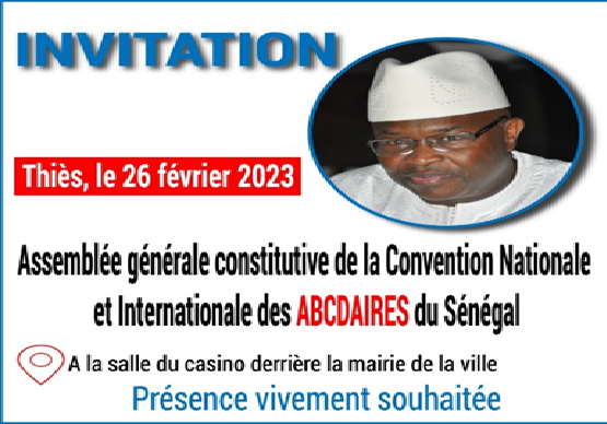 La conventionnationale et internationale des ABCDAIRES porte à la connaissance de ses membres, sympathisants, et du public, de la tenue de son Assemblée générale ce dimanche 26 février 2023 au centre culturel Léopold Sédar Senghor, ex Casino de Thiès à partir de 10h précise.
